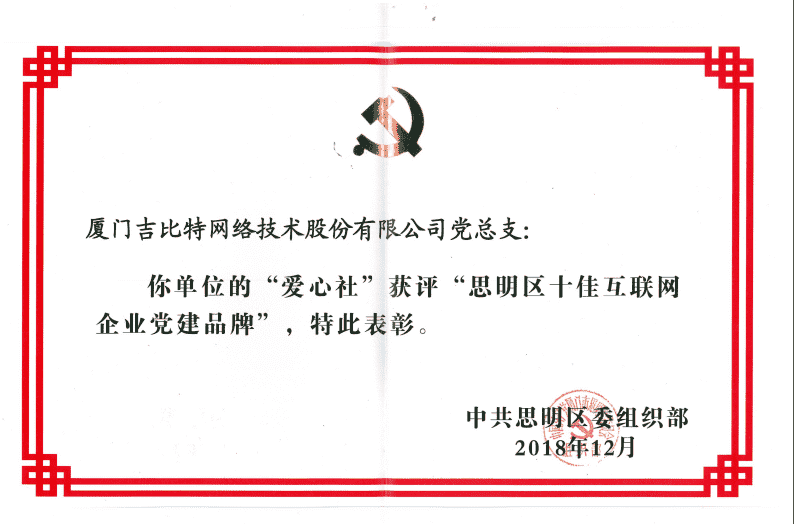 经初审评选、、、网络评选和专家评审等环节,,"厦门yaxin111网络技术股份有限公司党总支-爱心社" 从全区28个参评党建品牌中脱颖而出,,,获评"思明区十佳互联网企业党建品牌"。。。